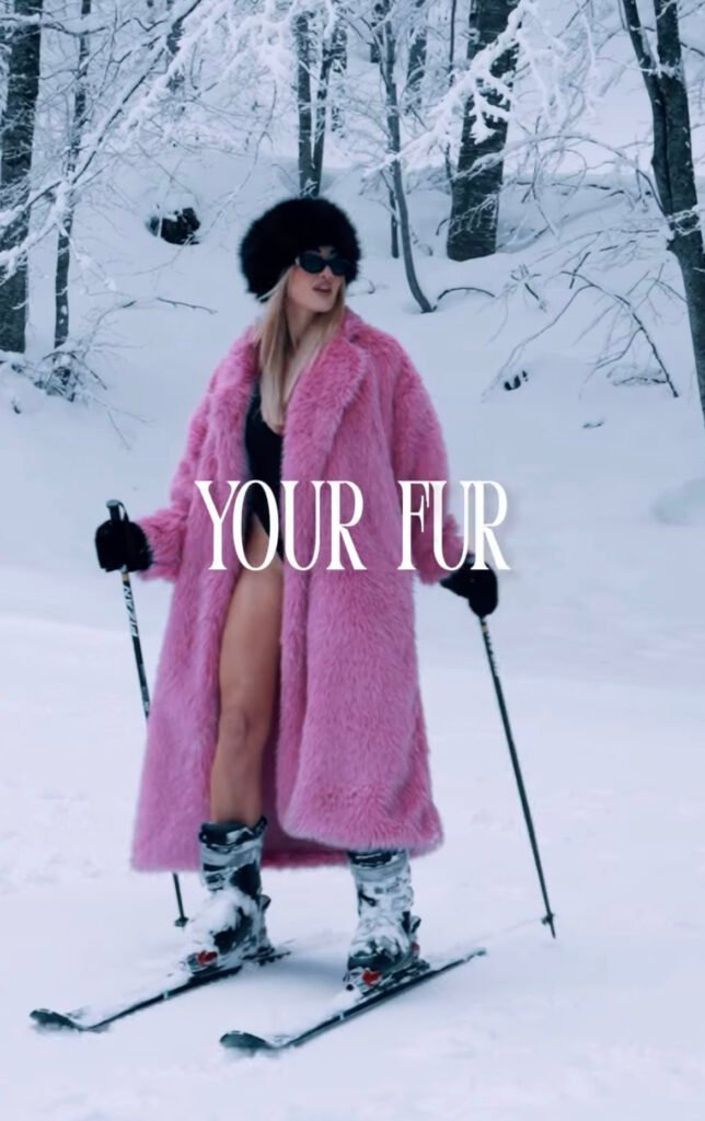 Αυτή τη φορά σκέφτηκε να επισκεφτεί τα χιόνια φορώντας καλοκαιρινά ρούχα και από πανω την fluffy ροζ γούνα της εταιρείας που που ήθελε να προμοτάρει! Πιο συγκεκριμένα για να αναδείξει ακόμα περισσότερο το ροζ πανωφόρι, η γνωστή επιχειρηματίας φόρεσε από μέσα μόνο ένα μαύρο κορμάκι, ένα fluffy μαύρο σκουφί, μπότες και πέδιλα του σκι.